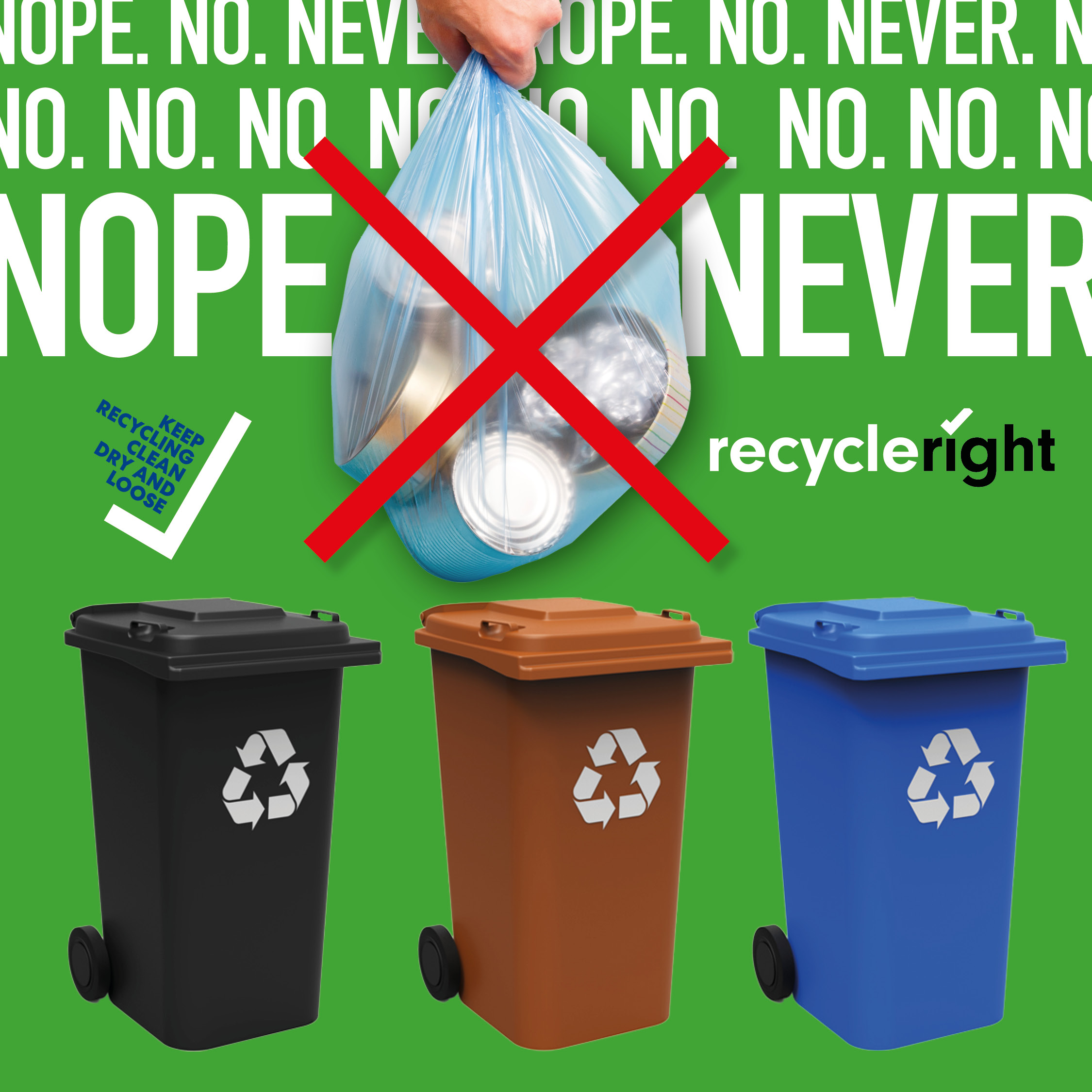 Leave em’ Loose: Recycling should always be placed in your recycling bin/bag loose, that means no plastic bags! Plastic bags can get caught in machinery, so just lift the lid and pop your recycling in, simple.